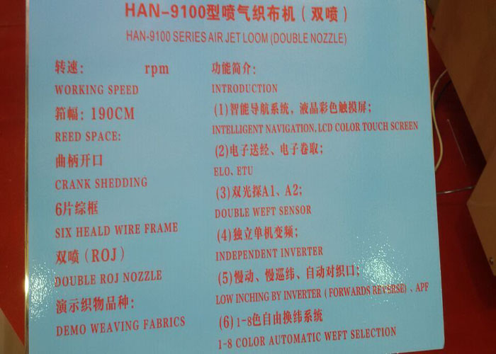 introduction:Intelligent navigation system, LCD color display width:190cm colors:2colors electronic weft feeder, can be equipped withr ROJ , Xin Liao, Sanhe SHEDDIG:crank shedding